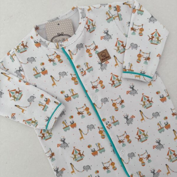 Macacão de algodão egípcio, com toque super gostoso, de manga longa com pézinho. Ele é branco estampado de tema circo, em verde tiffany, cinza e tons terrosos e fechamento em botões na parte frontal . Material: 100% Algodão