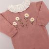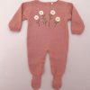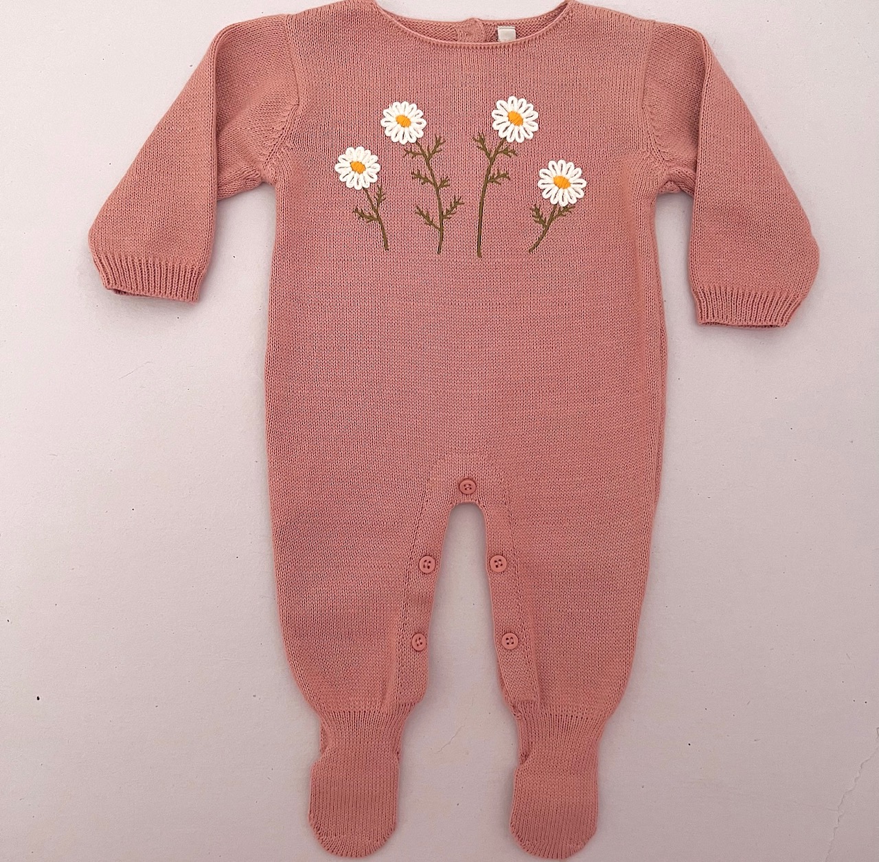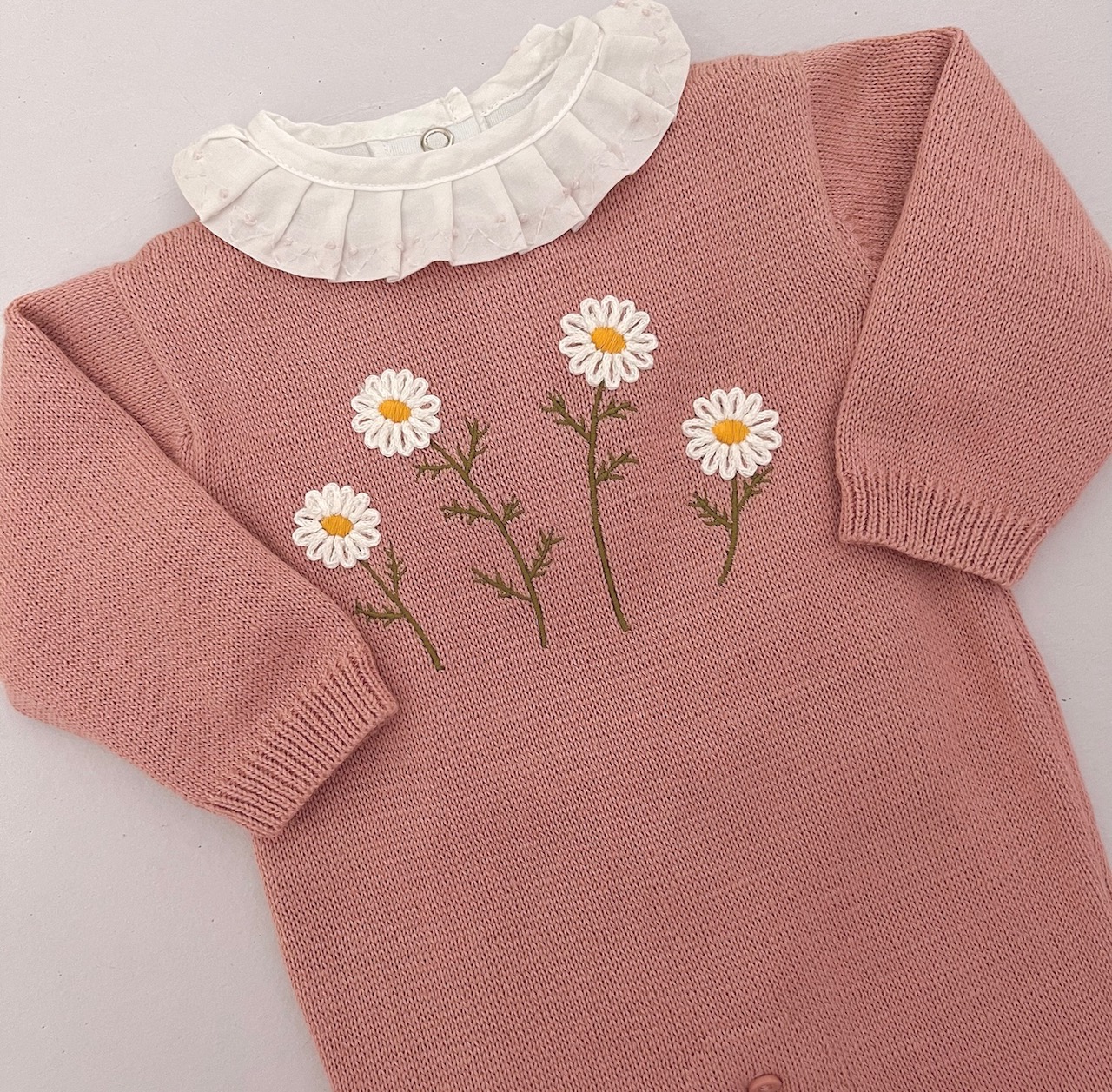 Macacão de tricot rosa blush com bordado de MARGARIDINHAS em relevo. Muito linda e delicada.
